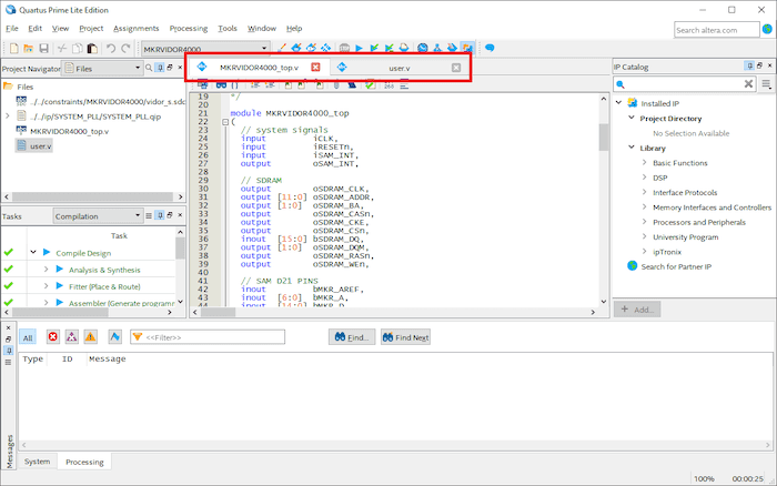 Compiling the design in Quartus.